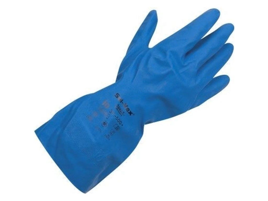 Rukavice ANSELL SOL-VEX BLUE 37-500, kyselinovzdorné. Kyselinovzdorné rukavice s obráceným kosočtverečným povrchem, AQL 0.65. Délka rukavice: 33 cm. Doporučené použití: výroba a příprava chemikálií, rafinace - nafty a benzínu, agrochemikálie. Odvětví: chemický, automobilový, sklářský a tiskařský průmysl, kovovýroba, zemědělství. nitril, podšívka - česaná bavlna