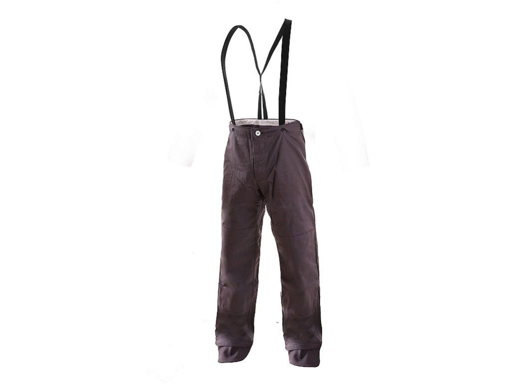Pánské svářečské kalhoty, šle s gumou vzadu, pevný pas se zapínáním na knoflíky, pravá zadní kapsa na suchý zip, zdvojená kolena, kryty přes obuv pro svářeče. Doporučené použití: svářeči, stavebnictví, slévárny, práce s hořlavinami, pájení.