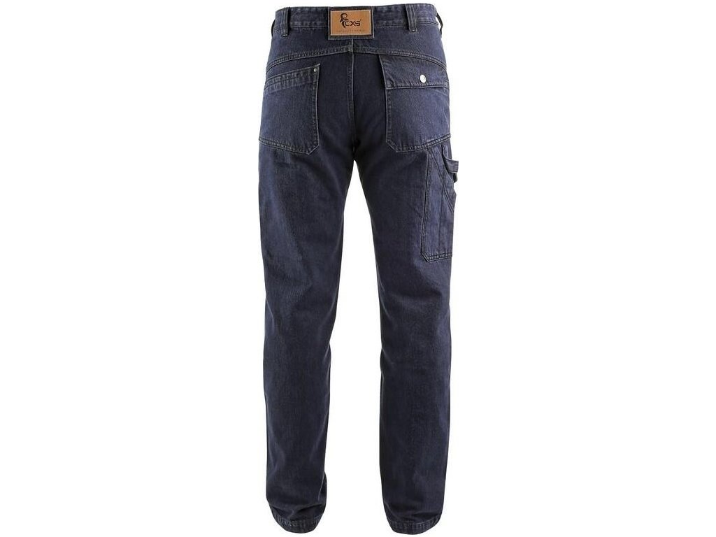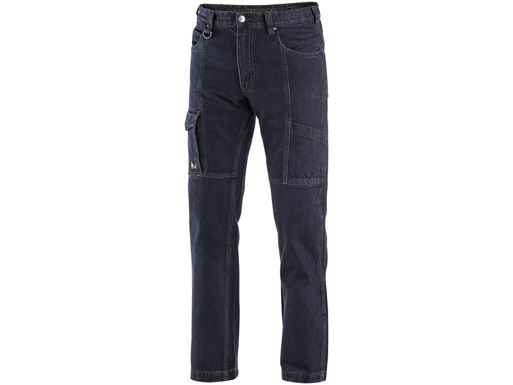 Pánské džíny, pas s poutky na opasek a plastovým přívěskem, vnitřní protiskluzová gumová páska v pase, 2 přední kapsy,boční multifunkční kapsy, na pravé kapse poutko pro kladivo.