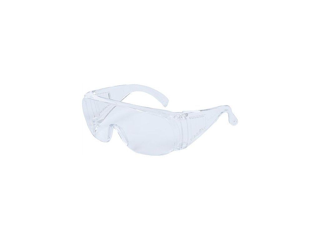 Ochranné brýle s čirým polykarbonátovým zorníkem tř. 1F; panoramatický tvar s možností nasazení na dioptrické brýle.