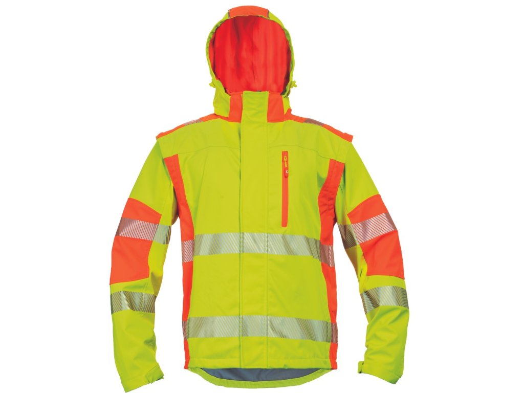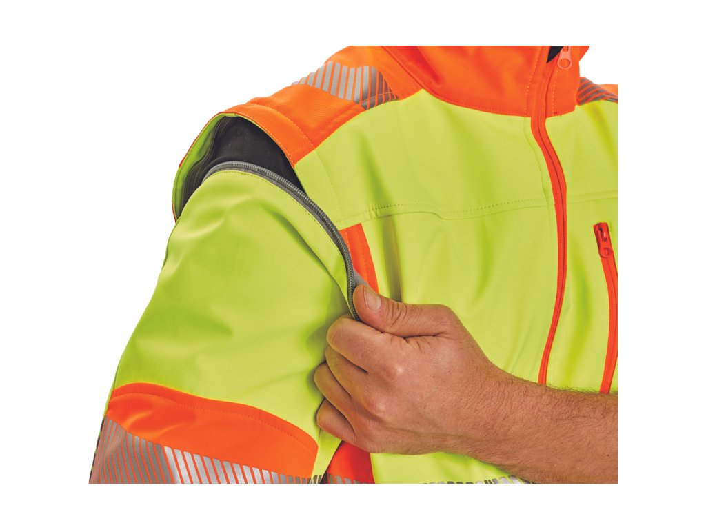 • kvalitní pánská prodyšná softshellová bunda s odepínatelnými rukávy a kapucí • dvoubarevné HI-VIS provedení • segmentované tištěné reflexními pruhy okolo boků a rukávů • větru a vodě odolný materiál s TPU membránou • 2 postranní kapsy na zip, náprsní kapsa na zip, 2 vnitřní kapsy • nastavitelná šíře spodního obvodu bundy pomocí stahovací šňůrky • nastavitelná šíře rukávů pomocí suchého zipu