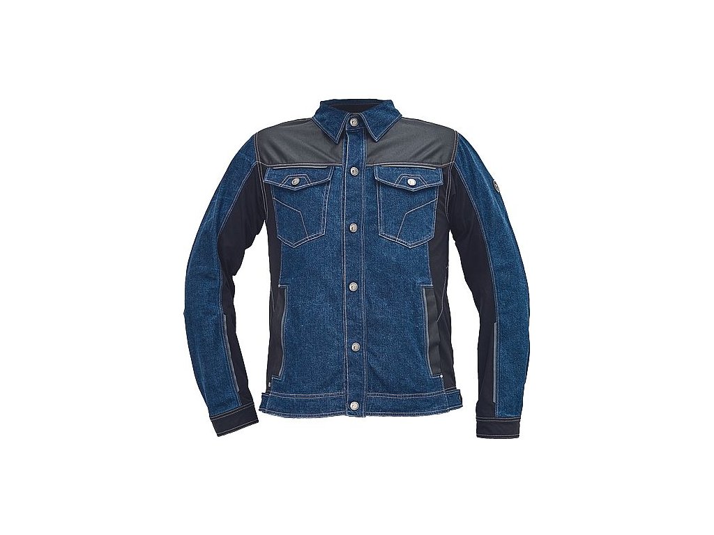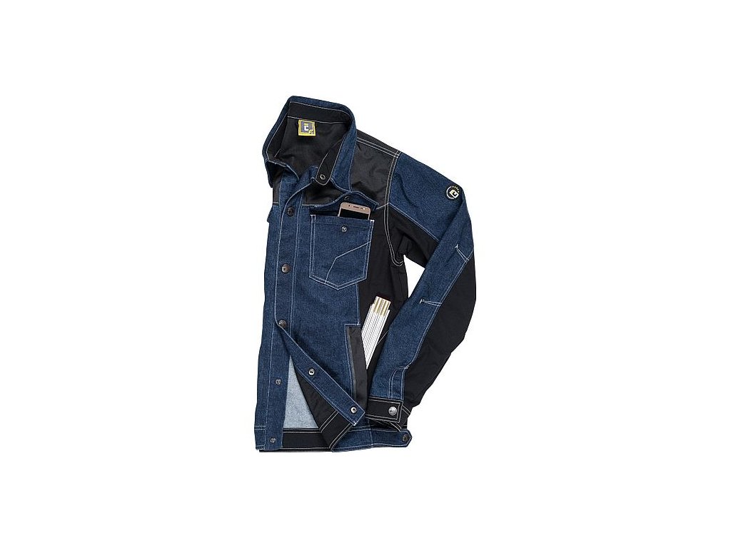 • pánská pracovní bunda jeansového vzhledu se zapínáním na druky • elastická předepraná Denim látka • materiál TRIFIBETEXPRO® a CORDURA® zesílení v oblasti ramen a rukávů • 2 boční kapsy • 2 náprsní kapsy na druk