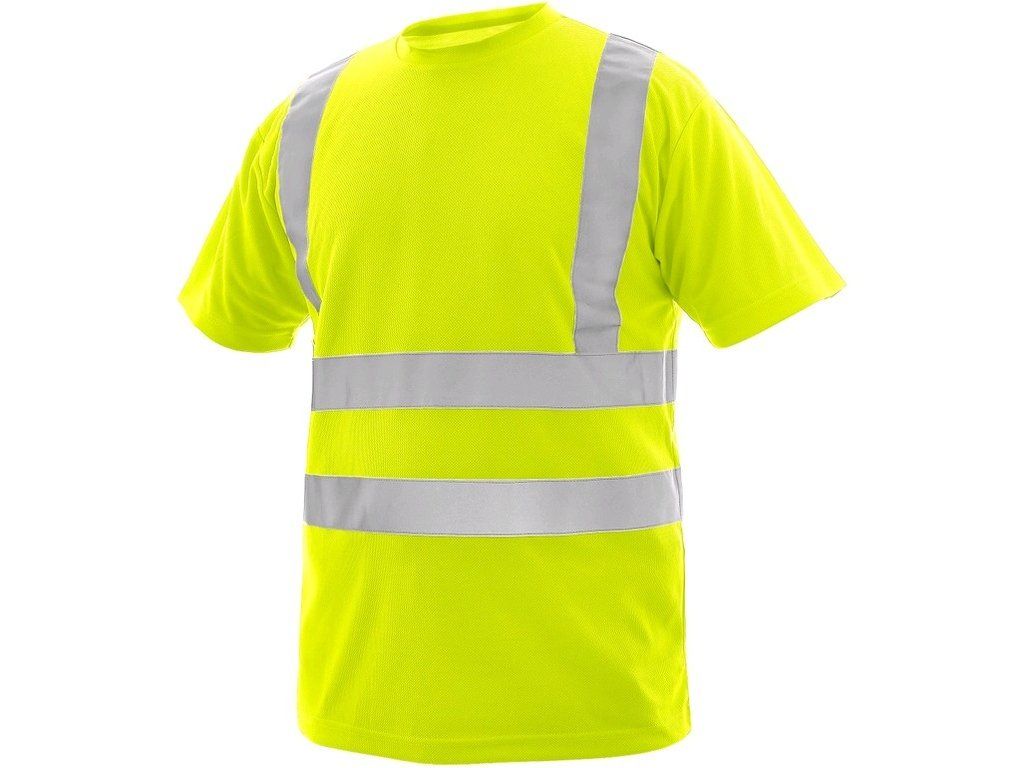 Výstražné triko s kulatým průkrčníkem, krátký rukáv, reflexní pruhy: 2 horizontální, 2 vertikální (šíře 5 cm). Doporučené použití: stavebnictví, silničáři, řidiči, logistika, údržba, kolo, motorky, skladování. Materiál: 100% polyester, 140g/m2.