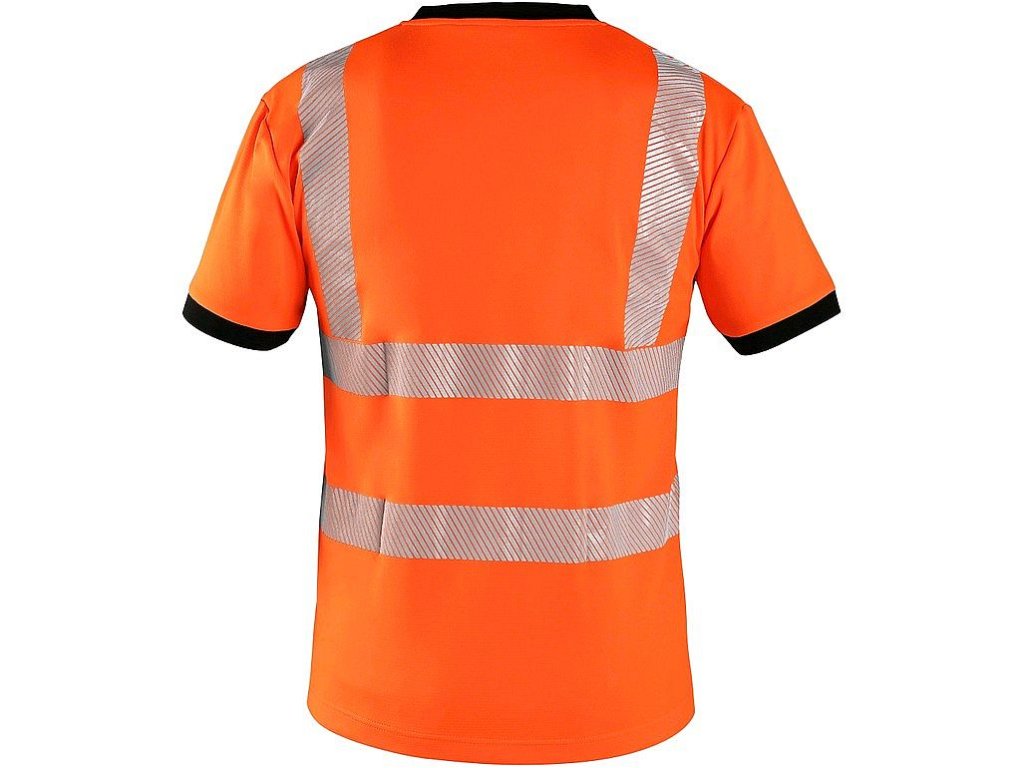 Výstražné tričko s krátkým rukávem, kontrastní olemování kolem krku a rukávů v černé barvě, průkrčník do V, zpevňující krční páska, postranní švy, větrání v podpaží, segmentované reflexní pruhy: 2 horizontální, 2 vertikální (šíře 5 cm). Doporučené použití: stavebnictví, silničáři, řidiči, logistika, údržba, kolo, motorky, skladování.