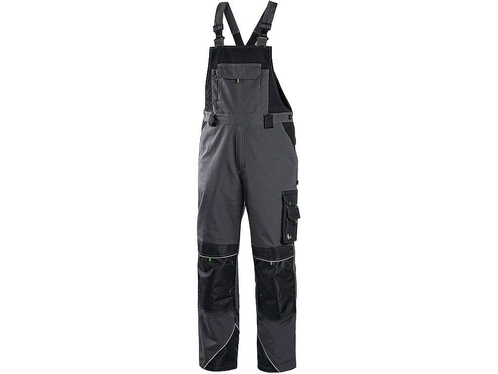 Pánské montérkové kalhoty s náprsenkou, náprsní kapsa s klopou, pas s poutky na opasek, v zadní části guma s knoflíkem pro přizpůsobení velikosti, přední klínové kapsy, multifunkční kapsy na obou stranách, kolena zesílena materiálem 600D polyester s možností vložení kolenních výztuh, dvě zadní kapsy s klopami, spodní část nohavic vyztužena materiálem 600D polyester, šle s gumou vzadu, reflexní doplňky. Doporučené použití: stavebnictví, strojírenství, lehký průmysl, automobilový průmysl, logistika, skladová manipulace, spedice, autoservisy, údržba, montáže, zemědělství, zahrada, hobby.