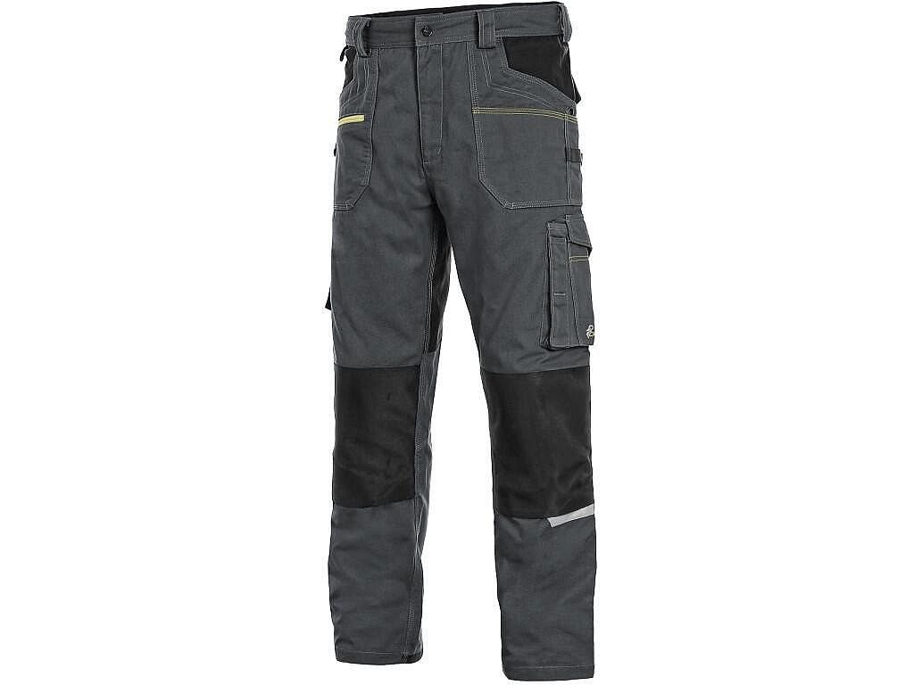 Pánské montérkové kalhoty - zkrácená varianta na výšku 170-176 cm. Strečová tkanina umožňující volný pohyb, pas s poutky na opasek, přední kapsy s kapsou na zip, multifunkční kapsy na obou stranách, kolena zesílena 600D polyesterem s možností vložení kolenních výztuh, dvě zadní kapsy - jedna s klopou, zadní spodní lem nohavice vyztužen 600D polyesterem, reflexní doplňky. Doporučené použití: strojírenství, stavebnictví, lehký průmysl, automobilový průmysl, logistika, skladová manipulace, spedice, autoservisy, údržba, montáže, zemědělství, zahrada, hobby.
