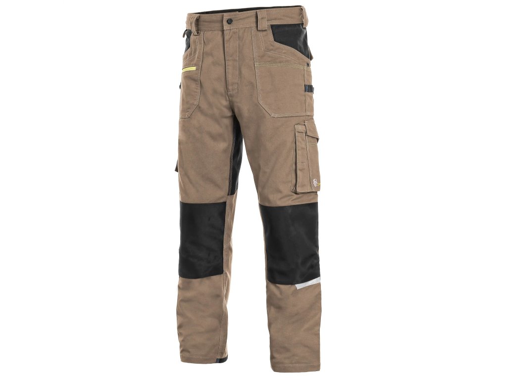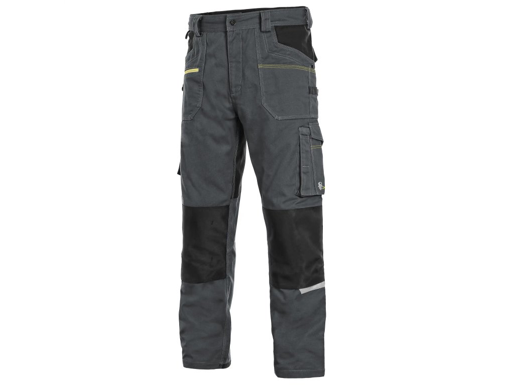Pánské montérkové kalhoty, strečová tkanina umožňující volný pohyb, pas s poutky na opasek, přední kapsy s kapsou na zip, multifunkční kapsy na obou stranách, kolena zesílena 600D polyesterem s možností vložení kolenních výztuh, dvě zadní kapsy - jedna s klopou, zadní spodní lem nohavice vyztužen 600D polyesterem, reflexní doplňky. Doporučené použití: strojírenství, stavebnictví, lehký průmysl, automobilový průmysl, logistika, skladová manipulace, spedice, autoservisy, údržba, montáže, zemědělství, zahrada, hobby.