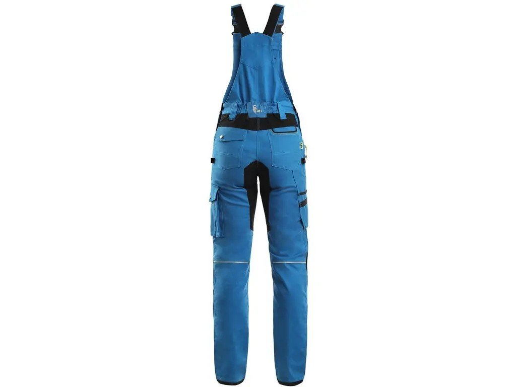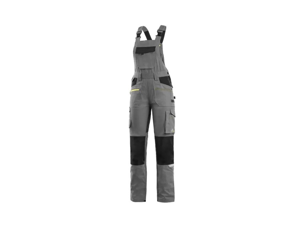 Dámské montérkové kalhoty s náprsenkou, strečová tkanina umožňující volný pohyb, náprsní kapsa s klopou, pas s poutky na opasek, přední kapsy s kapsou na zip, multifunkční kapsy na obou stranách, kolena zesílena 600D polyesterem, dvě zadní kapsy - jedna s klopou, zadní spodní lem nohavice vyztužen 600D polyesterem, šle s gumou vzadu, reflexní doplňky. Doporučené použití: strojírenství, stavebnictví, lehký průmysl, automobilový průmysl, logistika, skladová manipulace, spedice, autoservisy, údržba, montáže, zemědělství, zahrada, hobby.
