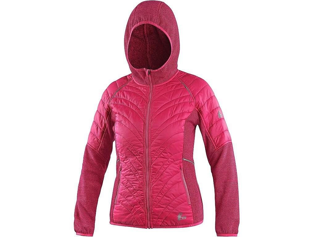 Dámská vycházková bunda z kombinovaných materiálů. Prošívaná část je lehce zateplená, zatímco kapuce, boky a rukávy jsou z příjemné pleteniny. Bunda má 2 boční kapsy na zip, zipovou ventilaci na zádech a reflexní doplňky. Pas a rukávy jsou ukončeny pružnou gumičkou.