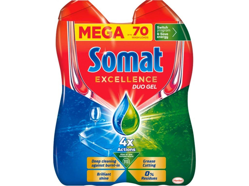 Gel do myčky Somat Excellence dokonale odstraňuje zbytky jídla i odolnou mastnotu a zanechává čisté a zářivě lesklé nádobí. Snadno rozpouští nečistoty a neulpívá na nádobí, proto se nemusíte obávat nevzhledných šmouh a zaschlých kapek. Eliminuje všechny odolné skvrny od čaje a kávy i bez předmáčení. Udržují taktéž i čistou myčku bez usazenin z čisticích prostředků. Somat navíc funguje i při nízkých teplotách na eko programy.