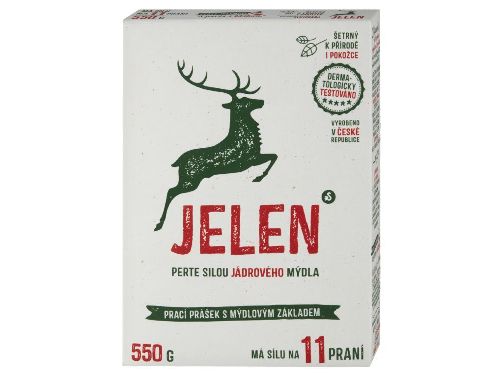 Jelen mýdlový prací prášek kombinuje přidané mýdlo, enzymy a kyslíkové bělidlo, takže spolehlivě čistí běžné i odolné skvrny a zároveň zůstává šetrný k pokožce. Prášek je dermatologicky testovaný, vhodný i pro dětské prádlo; balení vystačí na 11 praní při doporučené dávce 50 g a je biologicky odbouratelné a recyklovatelné.