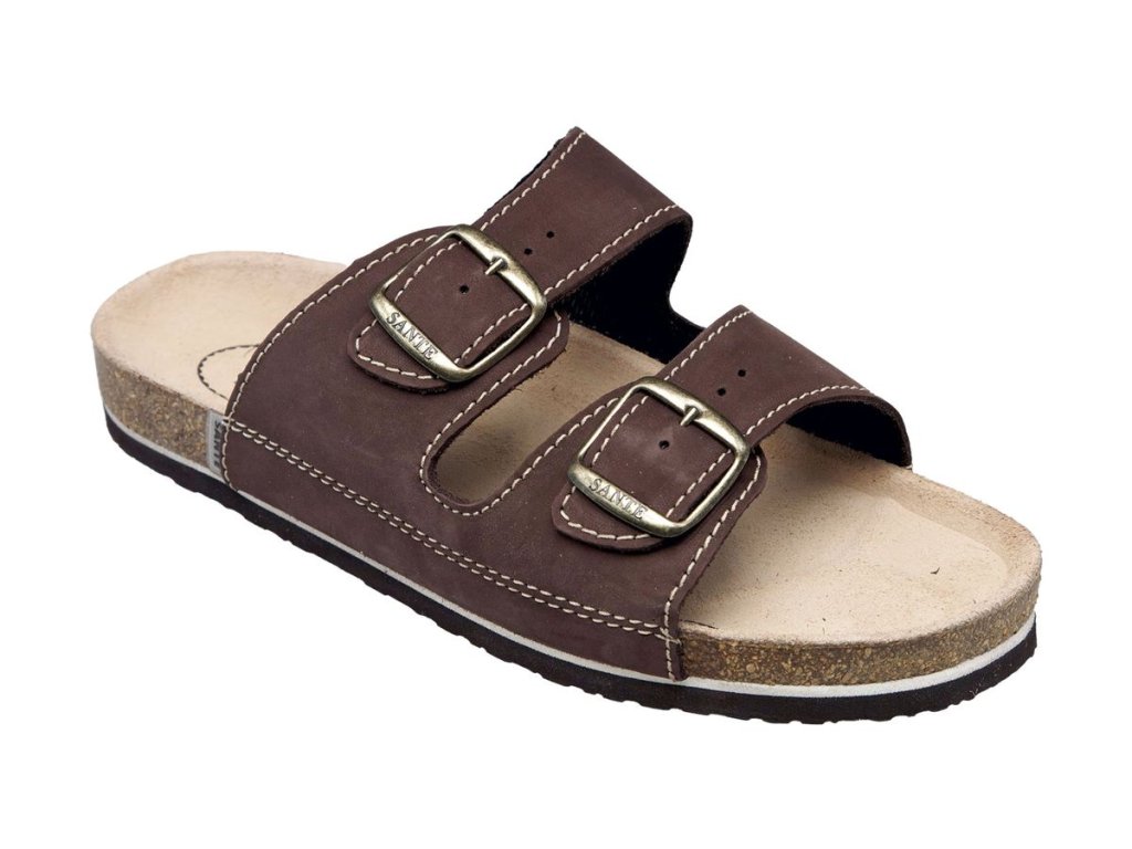 Pánský hnědý pantofel, pohodlná zdravotní obuv s anatomicky tvarovanou koženou stélkou, zabraňuje tvorbě ploché nohy. Jsou určeny jako zdravotní, pracovní, domácí či vycházková letní obuv. Podešev protiskluzová. Nastavitelná šíře obuvi - na dvě přezky. Certifikovaná obuv.