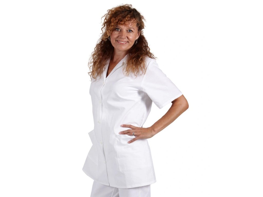 Dámská propínací prodloužená halena s rozhalenkou, mandlovací knoflíky, dvě dolní kapsy, pracovní velikosti.