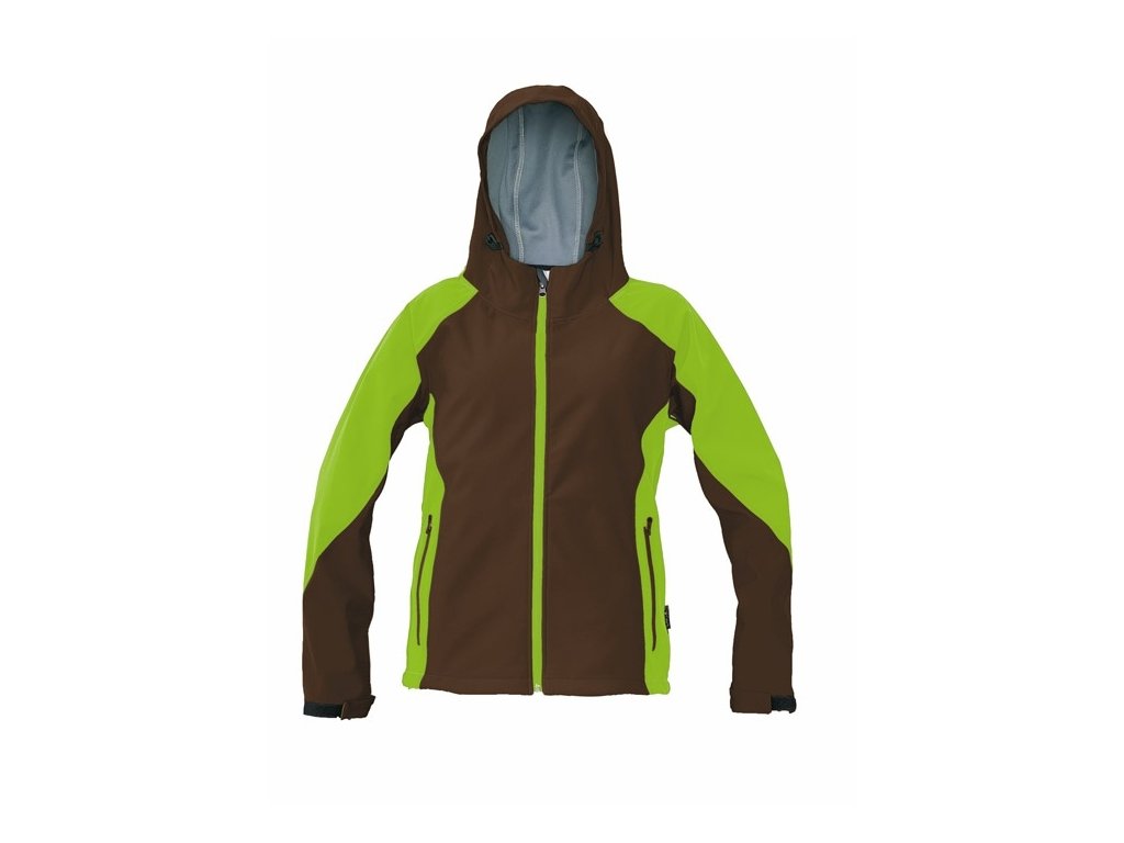 Dámská softshellová bunda s kapucí; voděodolná a prodyšná; 2 boční kapsy na zip; nastavitelná šířka rukávů pomocí suchého zipu; odvod kapuce lze nastavit pomocí stahovací šňůrky.